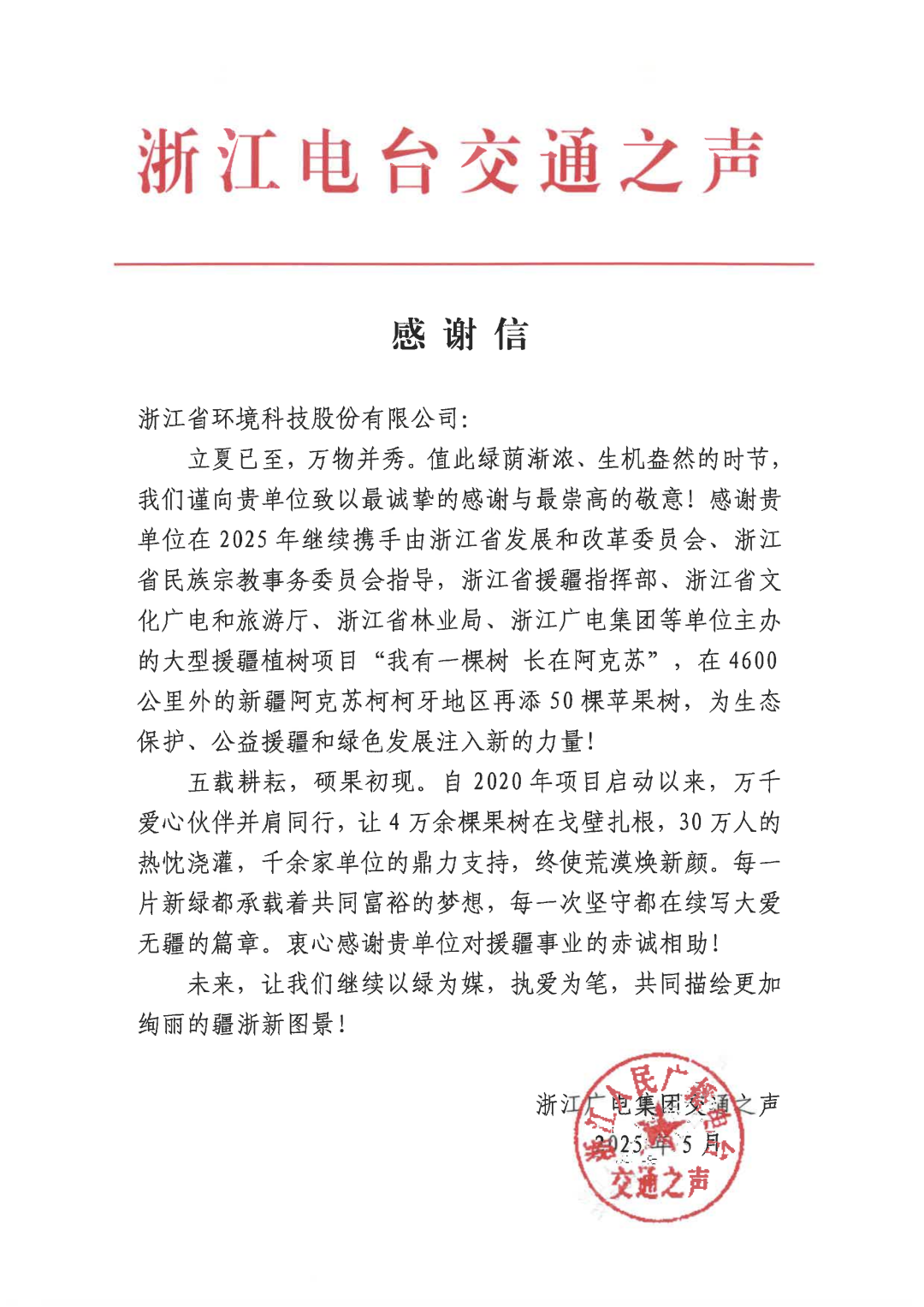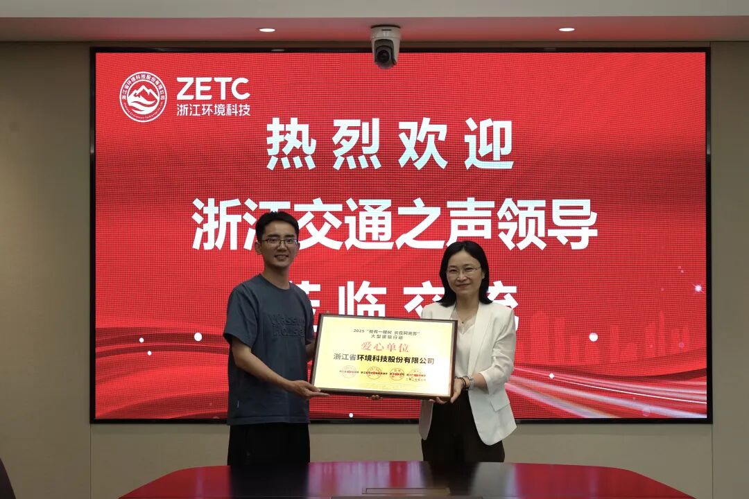 5月13日,浙江广电集团交通之声融媒中心副主任冯锁一行莅临浙江省环境科技股份有限公司,并为公司“我有一棵树 长在阿克苏”2025年大型援疆公益行动授牌,公司副总经理徐钰华出席会议。